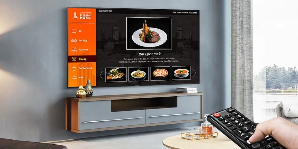 Digital concierge: In-room TVs can also be used to support interactive content, which means that guests can order in-room dining, book spa appointments and reserve other facility services without tying up your front-desk staff.
