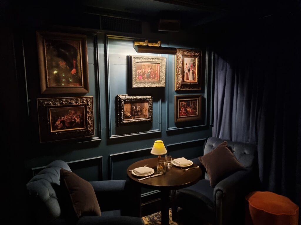 The deep earthy tones and the cosy atmospheric lighting alongside the antiqued brass frames add depth, with the light reflecting onto them and maintaining an intimate feel.