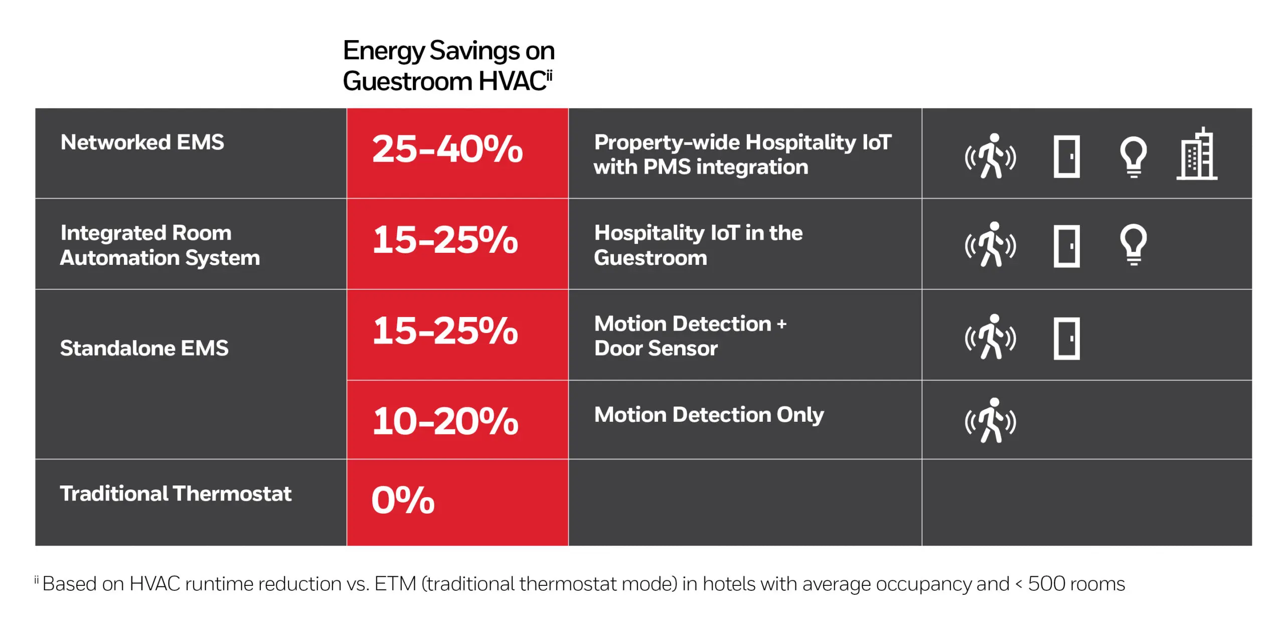 [ii] Based on HVAC runtime reduction vs. ETM (traditional thermostat mode) in hotels with average occupancy and < 500 rooms