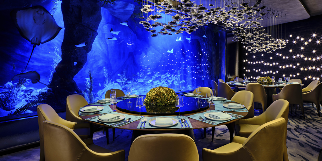 The Intercontinental Shanghai Wonderland, as indicated by its name, places guests in wondrous underwater surreal spaces filled with blue light and natural patterns and textures.