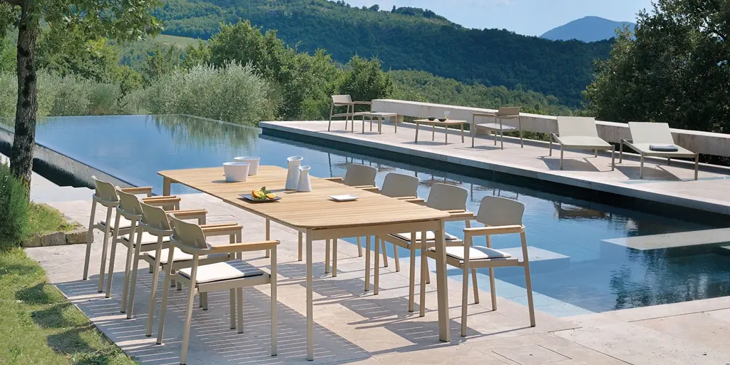 The color range used has a common thread that refers to the elements of Galicia and the characteristic colors of the area, from the colors of the sea to the vegetation and sunsets. Sofa, lounge armchairs, sunbeds and coffee tables bring a touch of elegance and style to relaxation and poolside areas with a simple and timeless design, at the same time welcoming that conveys well-being and tranquility.