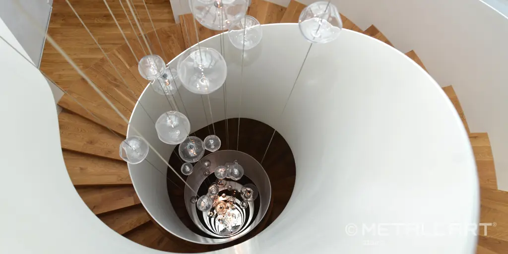 With its evenly rounded six-flight ground plan, realised with a diameter of approximately 4,050 mm, the construction successfully completes the classy character of the inspiring interior concept of the hotel. The noble wooden step covering for the folded tread structure and the modern white lacquering of the steel parts result in an utmost harmonious appearance of the staircase.