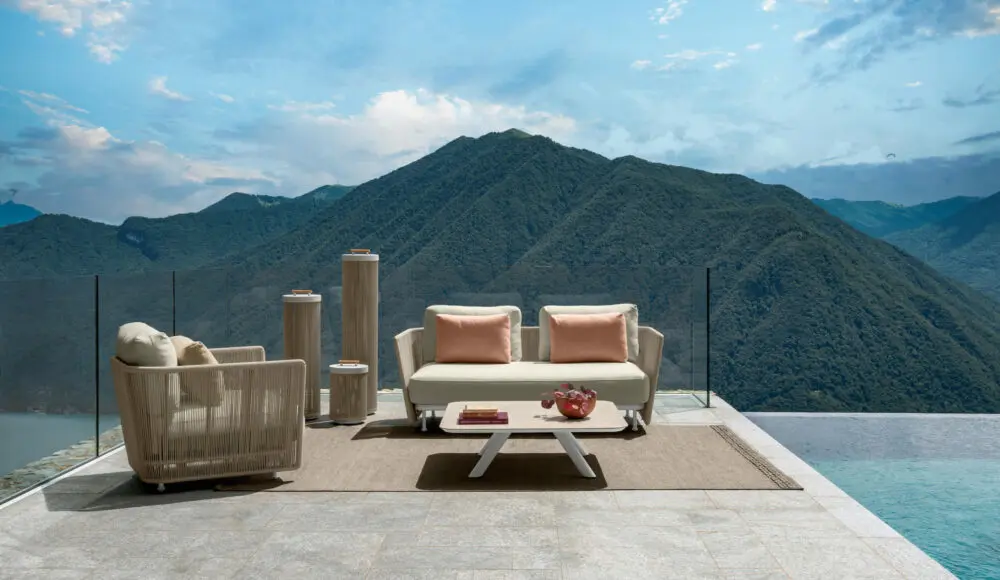 The theme of the rope is predominant, and it is possible to find it also as detail on the handles of the seats, in the lamps or in the pouf. The sofas, that are softened by the decorative cushions, are characterised by a solid volume of the seat that creates a contrast with the chairs and the lounge seats whose thin and refined frame introduces the theme of lightness instead.