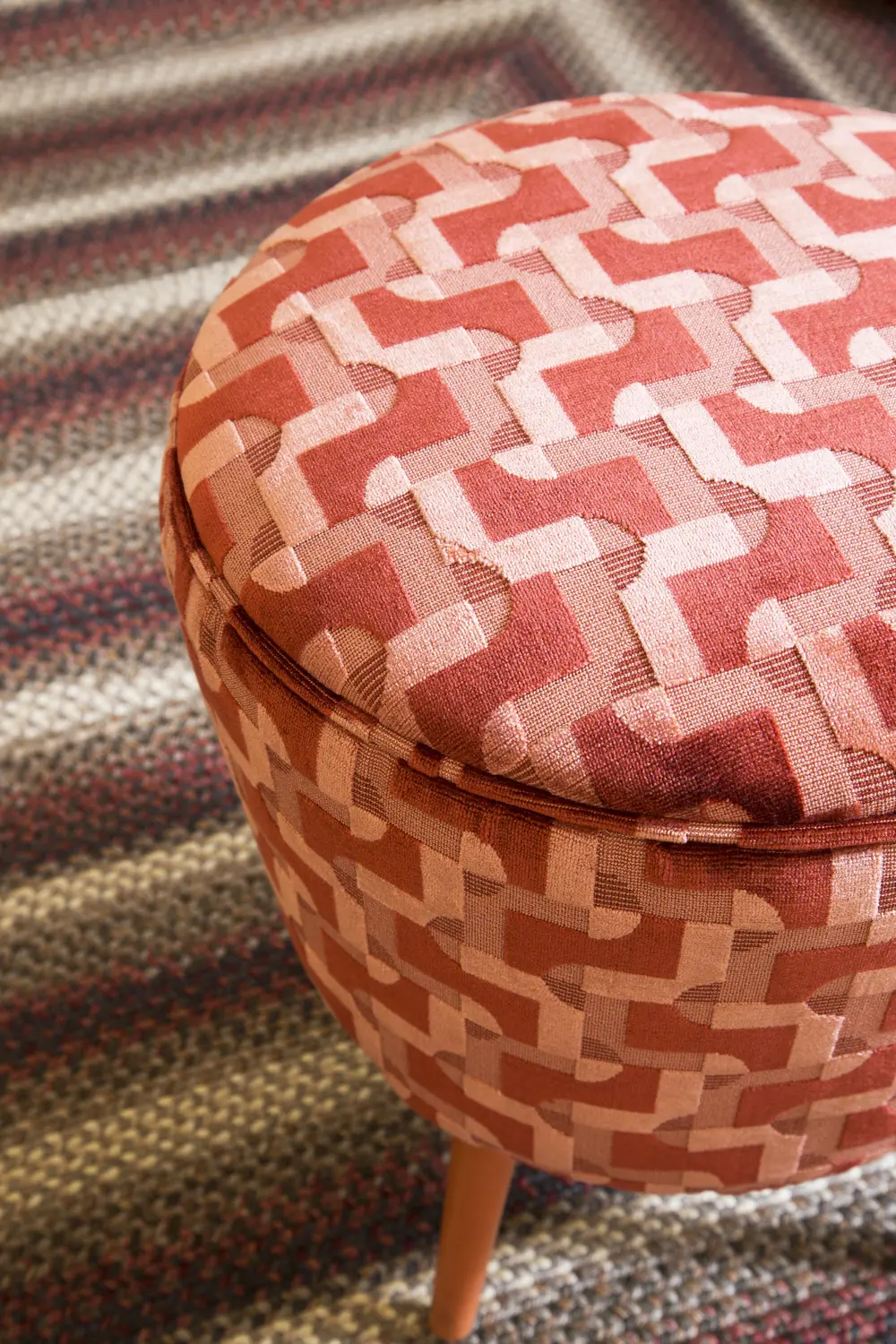 Mosaik features a geometrical pattern in velvet, combining straight and curved lines in cut and épinglé velvet. Inspired by the functionalist architecture of Le Corbusier, who eschewed ornamentation and whose basic tools were the ruler and the set square.