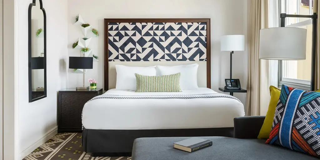 Unique in its identity, Hotel Spero’s design is a nod to Spanish Colonial Revival architecture, which is evident in elements like the hand-painted ceiling beams and travertine floors throughout the lobby, bathed in natural light.