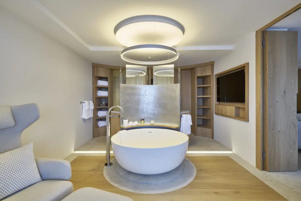 With the Therme Vals spa and the adjacent Hotel 7132, he has managed to create a feast for the senses. In the suites, Occhio’s new masterpiece is featured prominently: Mito sospeso 100 – a custom-made product – floats over the generous bathtubs, turning the relaxing bath into an unforgettable spa experience. A pure pleasure for both body and eye! Made from 60.000 slabs of Vals quartzite, the thermal baths Vals blend in perfectly with the surrounding archaic nature of the Swiss canton Grisons.