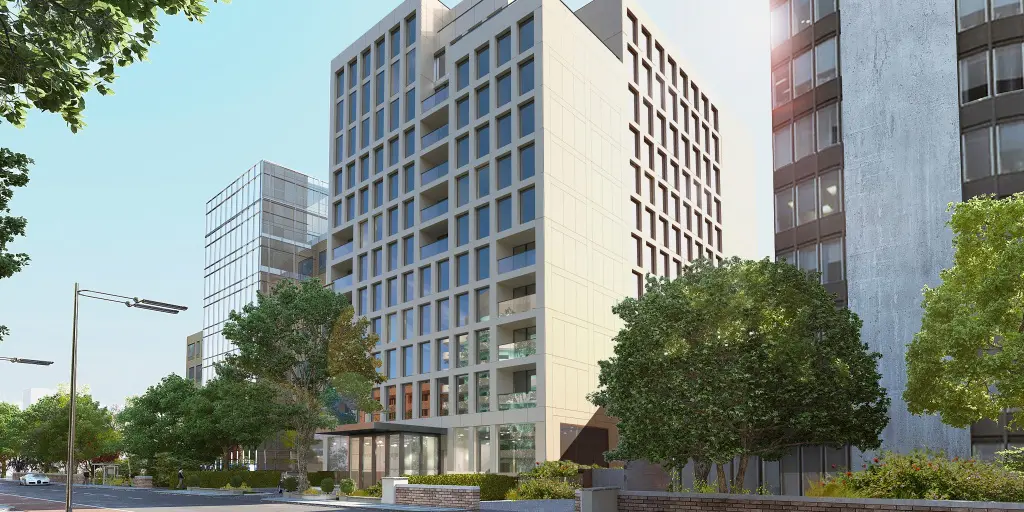 The building has been designed to respond to its location, both its immediate local setting and in the larger context, including views towards the building from the adjacent conservation area. It will be 12 storeys high, including ground level, with open air plant on the roof contained within a louvred screen stepped back from the main building façade. The entire building is set back from the street, providing a landscape buffer zone between hotel and road, thus enhancing the local boulevard concept.