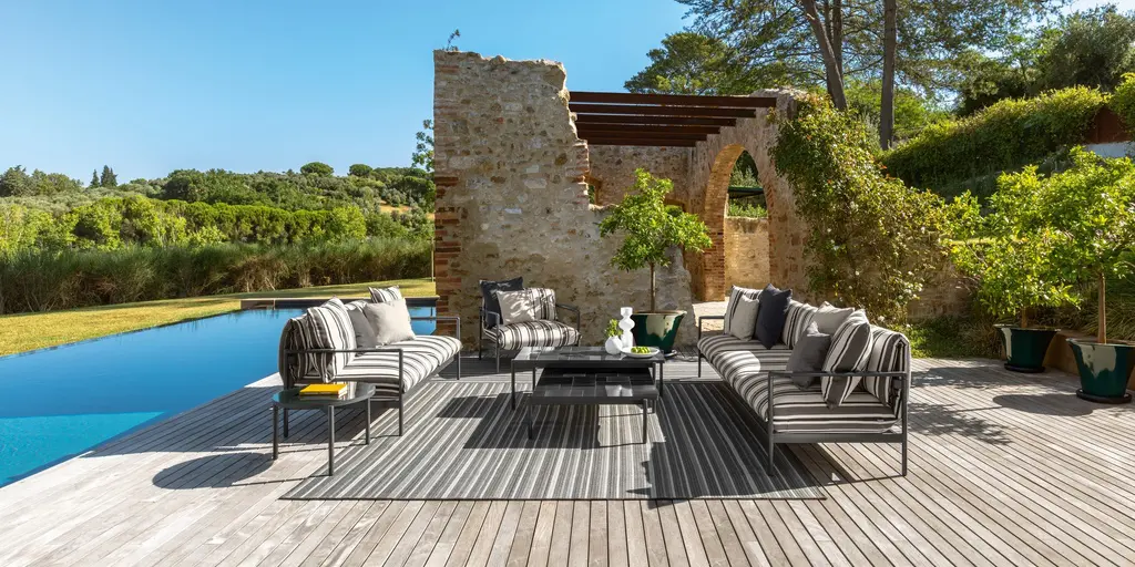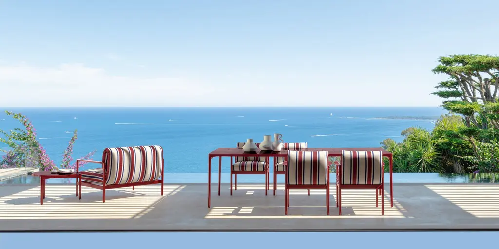 “Nalu is a collection that, especially through the use of ceramics, works on colour,” explains Ludovica Serafini. In fact, the colours available, ranging from red to deep blue, passing through the more versatile silk grey, warm white and graphite, allow for infinite combinations and revive the match between the mosaic effect of the tables and the vertical lines of the coverings, structure or carpets, all in perfect synchrony. A special focus in the design was given to the sustainable component, which for Talenti is not a trend but an entrepreneurial vision. The structure is made of 100% aluminium, which is not only resistant to atmospheric agents, but also environmentally friendly.