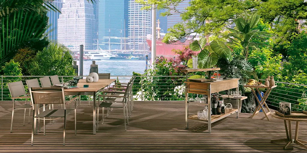 Among the new solid extending table and sun lounger, Quadro Collection offers a multifunctional buffet table with an integrated champagne bucket.