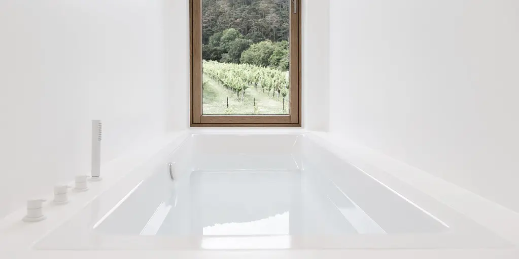 The home’s owners can thus enjoy a relaxing bath while feeling that they are sitting in the middle of a wine terrace. This superbly soothing setting make this the perfect spot for them to savour a fine wine made from their own grapes.