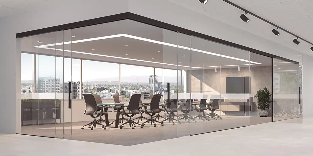 Rollglass+ unique design combines fixed interior architectural glass walls to sliding glass doors. Its easy and intuitive assembly ensures architects, interior designers and installers complete architectural integration, especially in case of recessed mounting into dropped ceiling.
