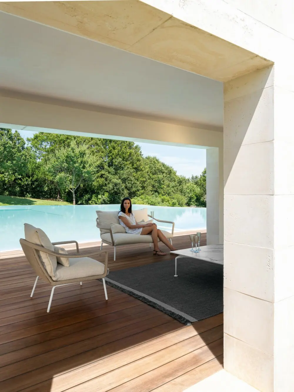 Teak and aluminum structure, braided ropes and latest generation coverings, the Italian brand bets on the synergies between materials.