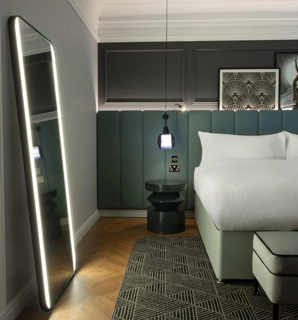 The stunning rooms with a contemporary, glamorous soul designed by Upperworth Studios for the hotel needed the final touch: the right mirror. We were looking for an elegant, modern, yet understated, technologically advanced and chic solution.